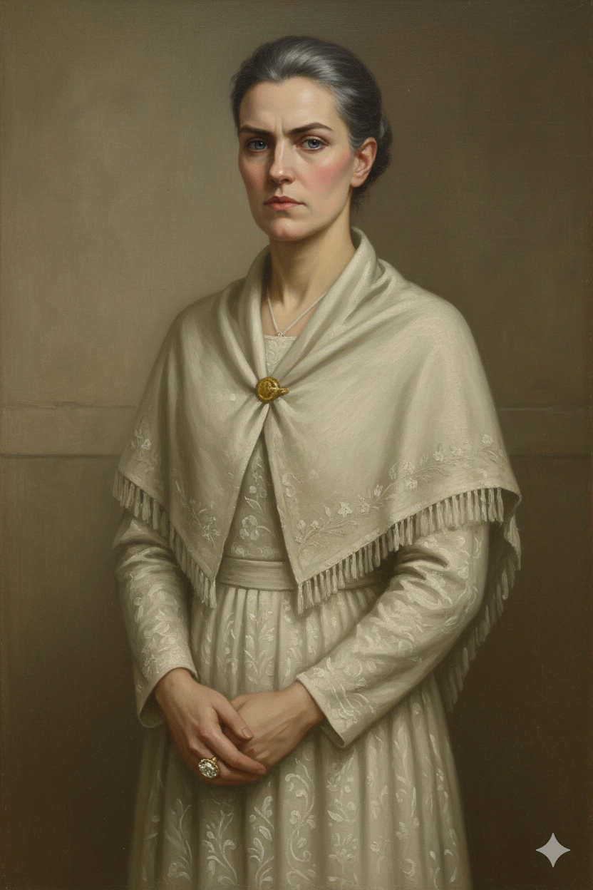 She was a tall woman with silver-gray hair, a thrusting chin, a smooth face, and "startling" blue eyes.[1]