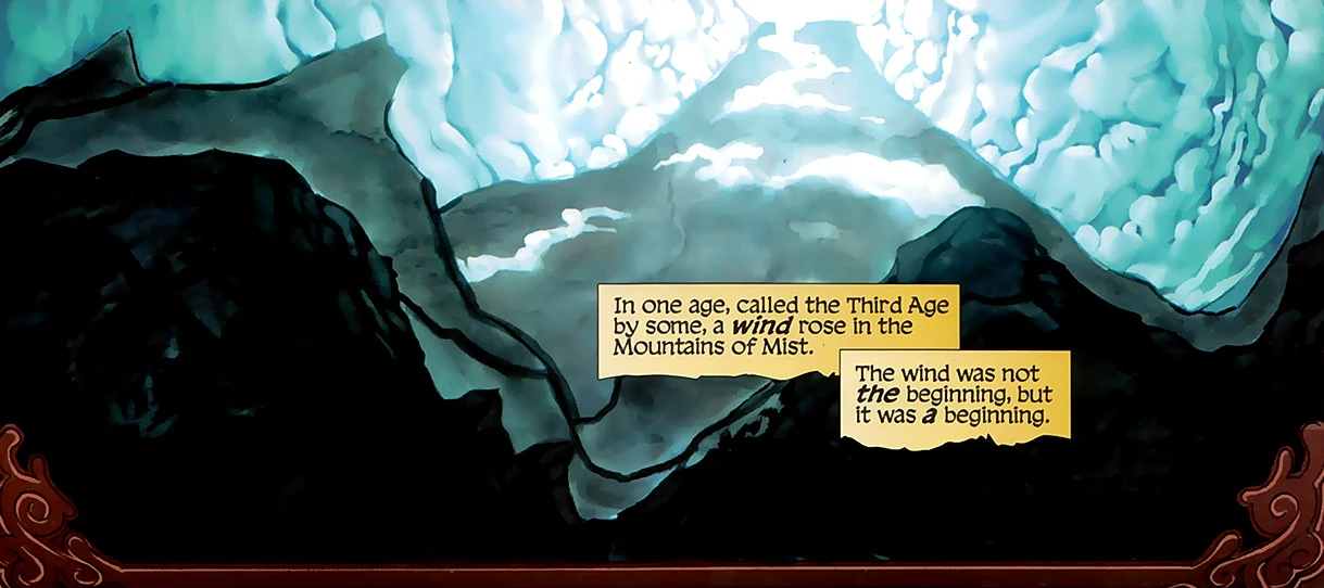 Evidence suggests that the Mountains of Mist did not exist during the Age of Legends, when the area was covered by the shallows of a great ocean. During the Breaking of the World, insane male Channelers raised the mountain range and drove back the sea. The disturbance of the adjacent shoreline would become the sand hills, and the rocks, ores, and minerals locked below the ocean floor were forced into enormous vertical displacements forging vast crags and peaks.