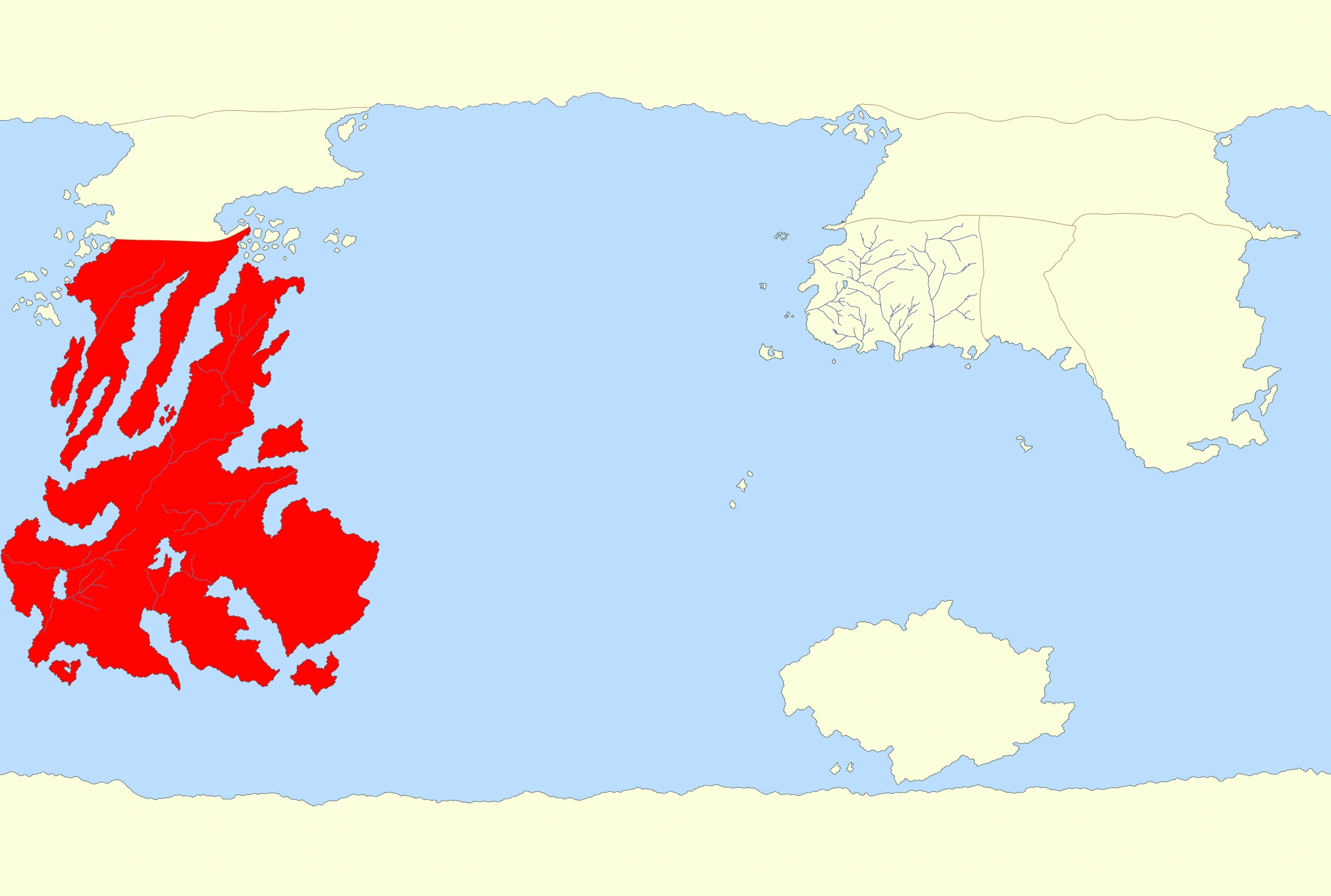 The southern landmass is by far the larger of the two. It is located mostly within the southern hemisphere, but a huge peninsula extends north and east for several thousand miles into the northern. The imperial capital of Seandar is located on this landmass, roughly due west of the island of Tremalking. Seandar is located at the meeting point of two substantial river networks.