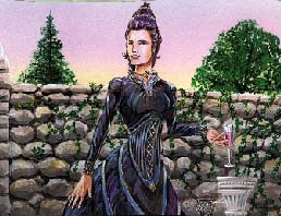 She is pale with very long dark hair and dark eyes. She is young and pretty. She is 5'3" or 160 cm. Her nobility allowed her to wear six thin stripes on the front of her coat.
