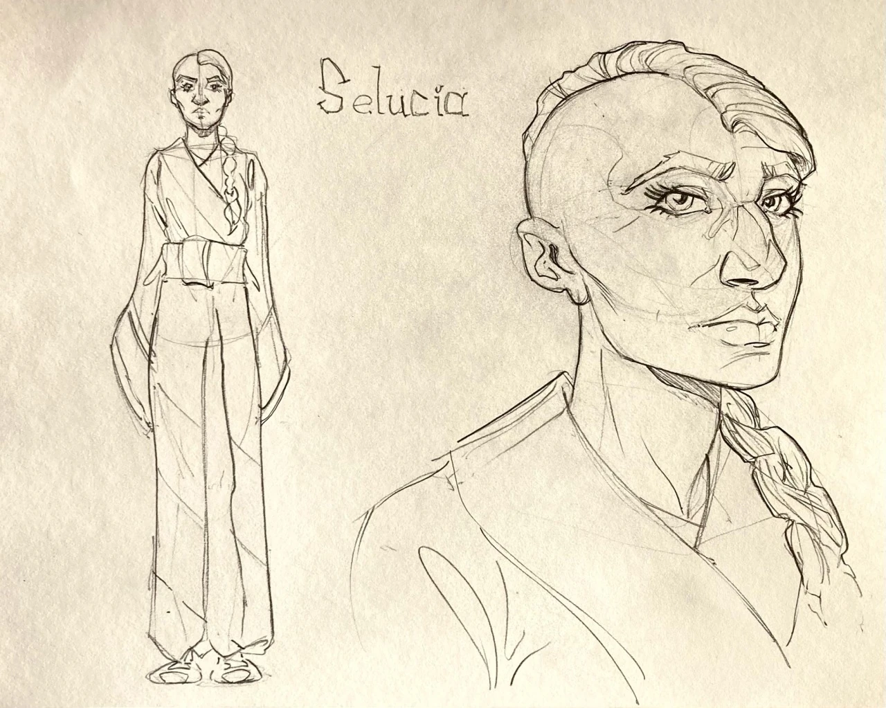 Selucia is described as being beautiful with blue eyes, gold hair, and creamy skin. Standing at average height, the left side of her scalp is shaved and she appears to be in her mid-forties.
