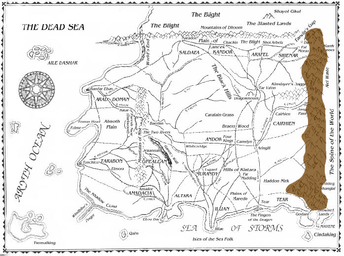 The Spine of the World is a vast mountain range that stretches from the Blight in the north to the Sea of Storms in the south, forming the eastern border of the Westlands and separating it from the Aiel Waste and the Termool to the east. The rivers Erinin, Iralell and Gaelin all flow out of the Spine. The Aiel refer to the Spine as the Dragonwall.
