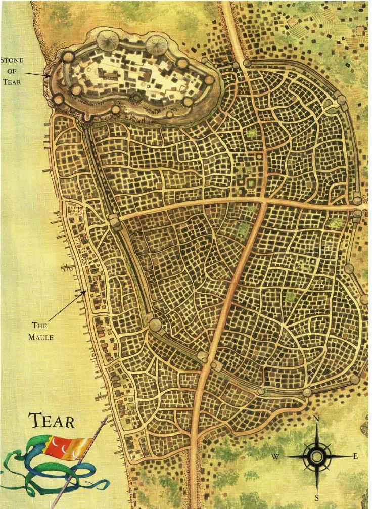 Tear is considered the greatest port city upon the Sea of Storms, located above the mouth of the River Erinin and guarded by the Stone of Tear.[1] It is large as Caemlyn and Tar Valon, but not considered as beautiful as either.[2]
