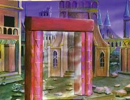 More of Sulwin's cronies were unloading one of the wagons, and a large flat crate had fallen, half breaking open to reveal what looked like a polished doorframe of dark red stone.[8]